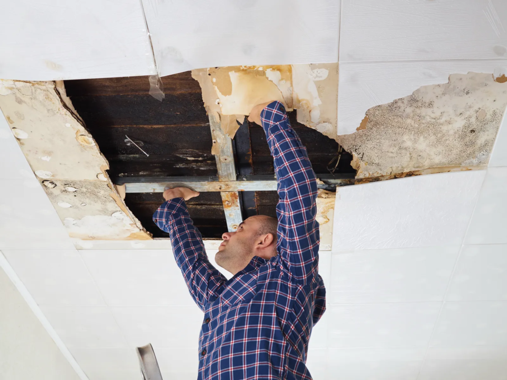 On flat roofs, water can travel significant distances before it becomes visible inside. The original flat roof leak source may be several feet away—or even across the building—from the interior damage.